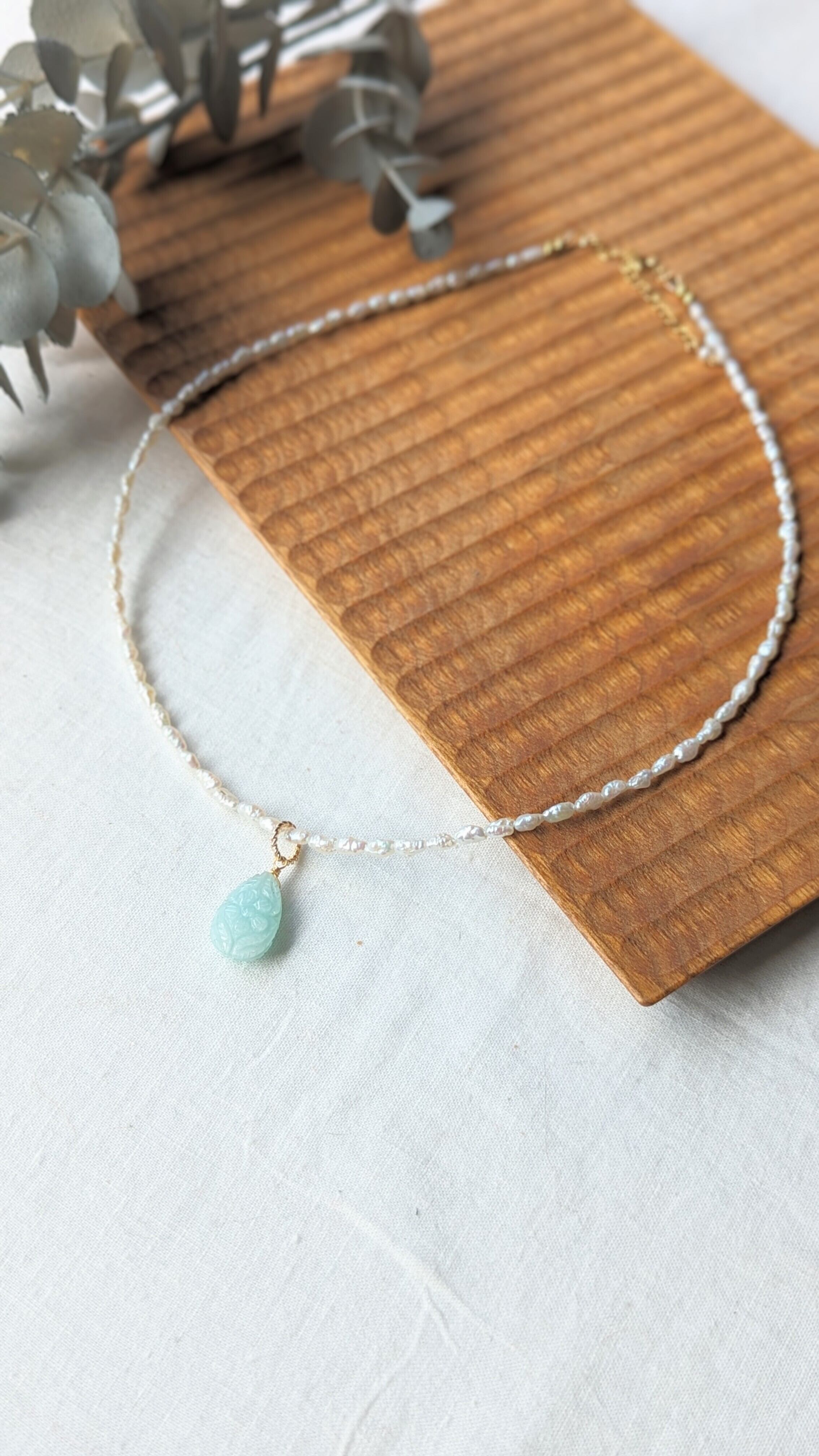 ペンダントトップはミントグリーンのアマゾナイトのぷっくりしたかわいいフラワーカービングです