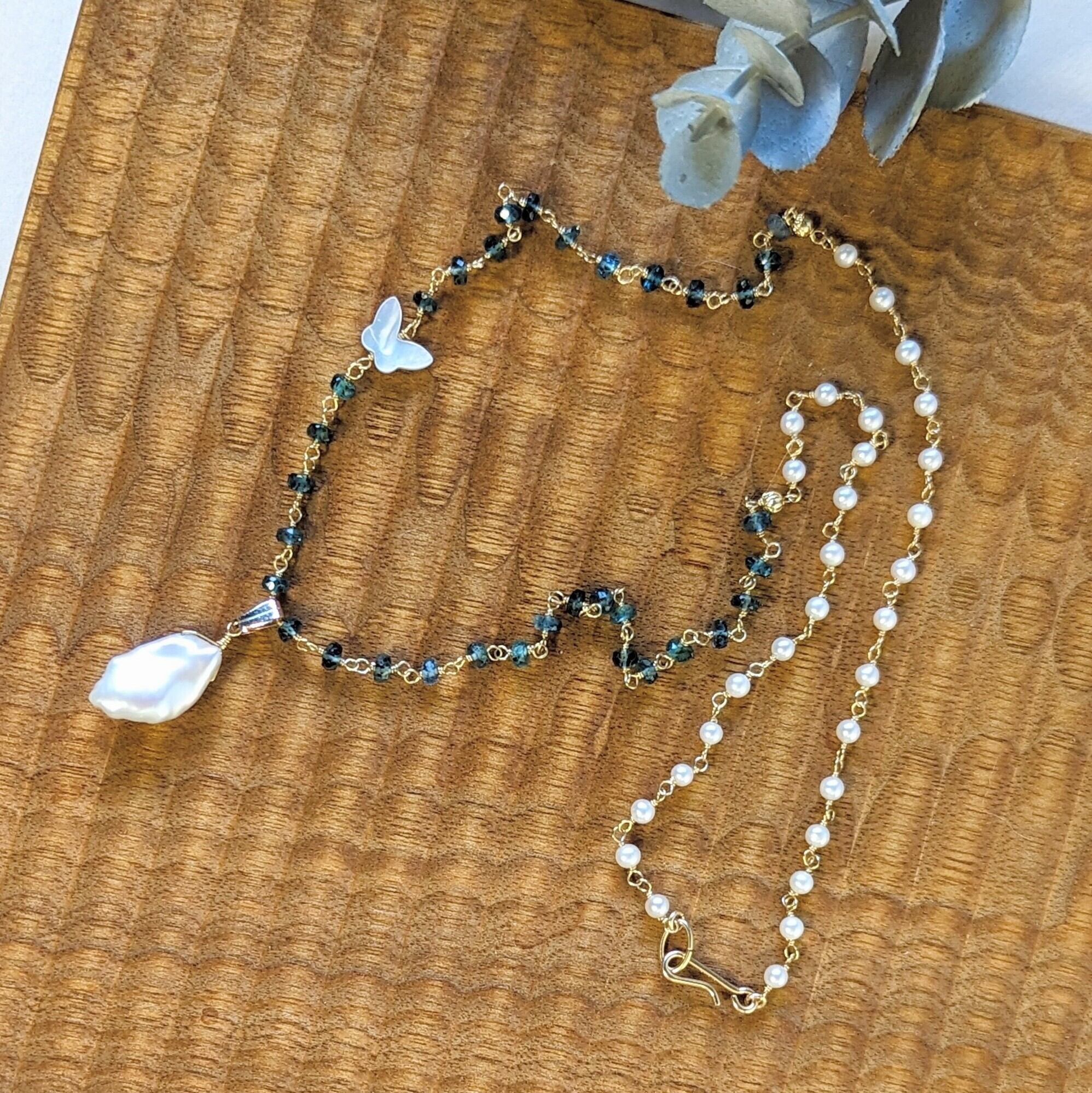 蝶のアクセントが可憐なブルーグリーンのトルマリンと小粒の淡水パールのネックレスです
