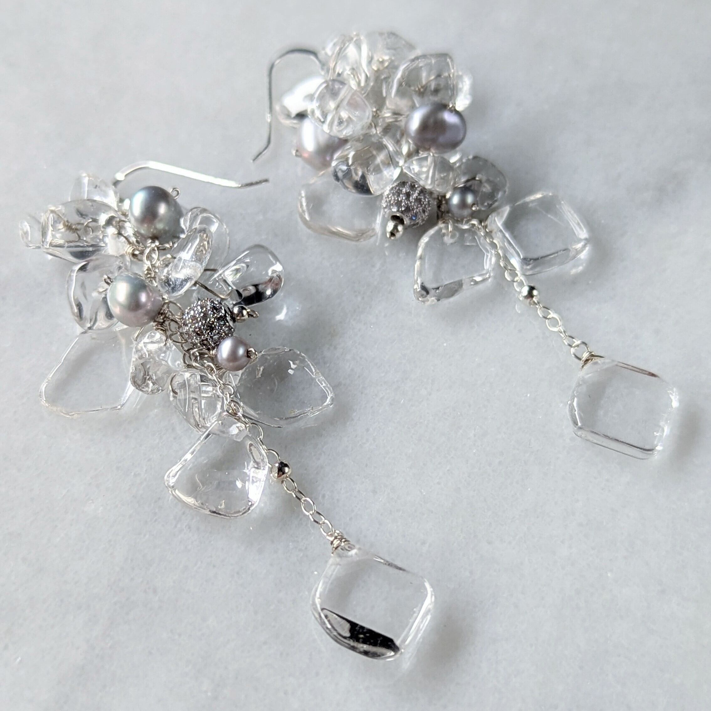 透明度抜群の天然水晶が耳元でシャラシャラと揺れるのが涼し気です